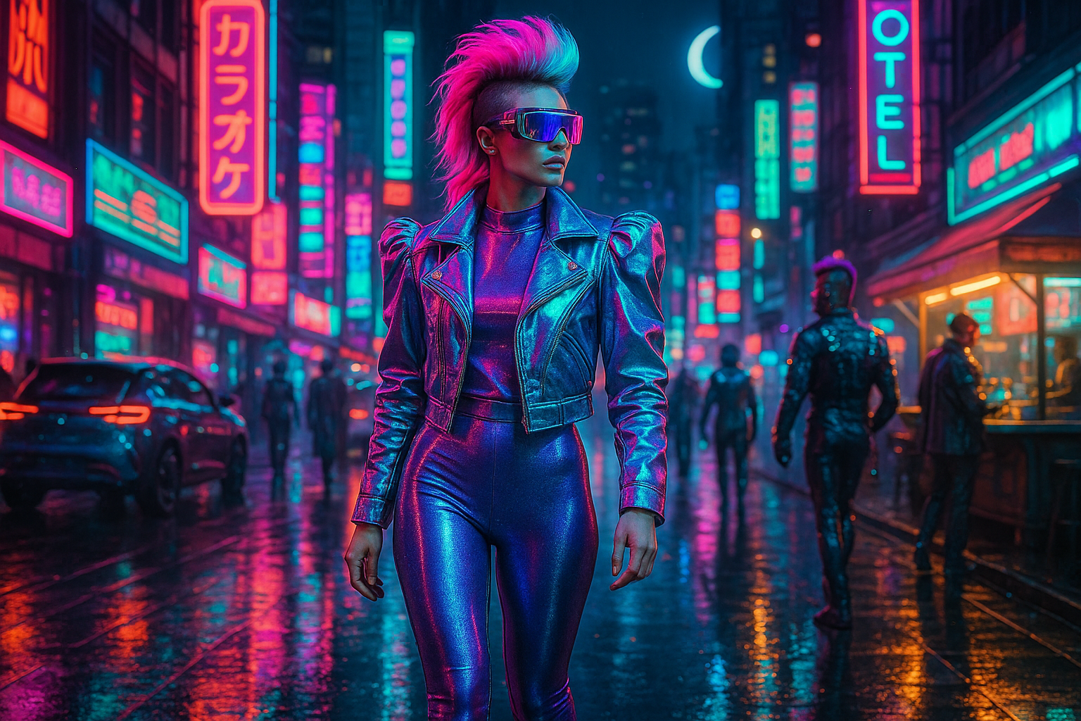 Imagine a cityscape bathed in neon light, where towering skyscrapers pierce the night sky, and the air is thick with a